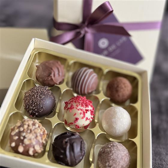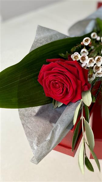 Single Red Rose with complementary foliage, Gift wrapped together with a box of our 9 assorted Chocolate Truffles, presented in a gift bag