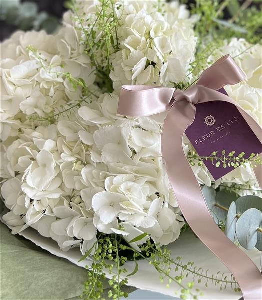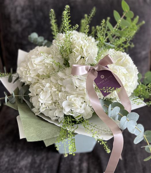 Beautiful White Hydrangea's paired with Eucalyptus & Thlaspi, presented as an Aqua Bouquet