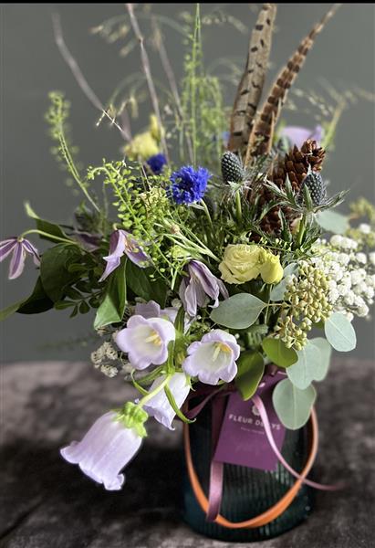 This gorgeous Blue glass lantern filled with Blue, Lilac & Cream flowers. Enjoy the flowers and then afterwards fill with your favourite candle light up and enjoy your lantern forever…