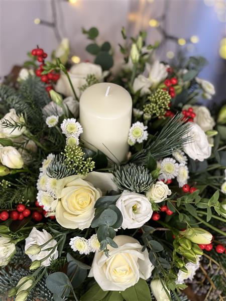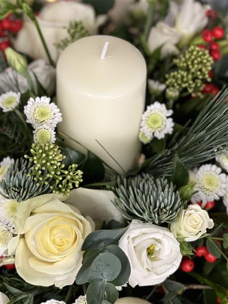 A classic round white candle centrepiece arrangement. White Roses, complemented by Lisianthus,Freesia, winter foliages and a dash of Eucalyptus & Ilex berries