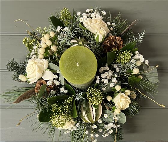 A stunning snowy white table arrangement featuring a Beautiful rustic Green pillar candle in the centre of white spray roses, skimmia with scattering of Gypsophelia with assorted festive foliages, cones ,Limes, gold birch twigs & feathers.