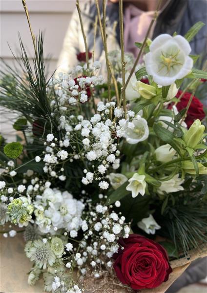 Aqua Bouquet including, assorted festive foliages,Gold Birch Twigs, Red roses, Burgundy dianthus, Campanula, Socks, Gypsophelia ,Astrantia