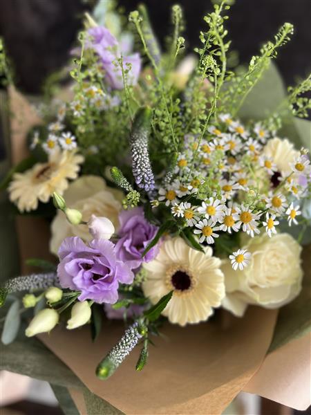 A delicate array of soft pinks, lilacs & lemons. This beautiful display is arranged in a White Ceramic Jug