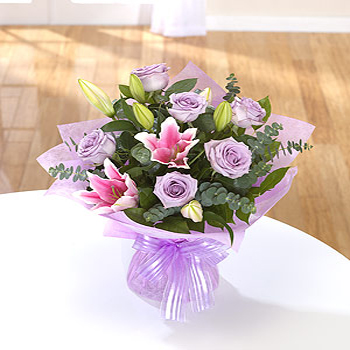 Lavender Roses and pink Lilies make this arrangement beautifully soft and gentle.