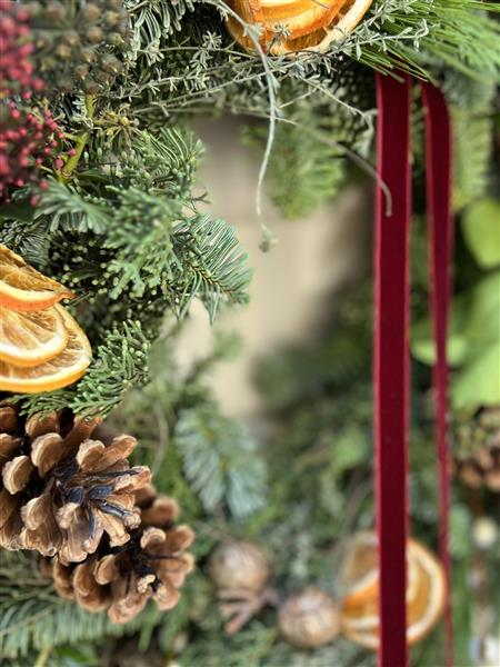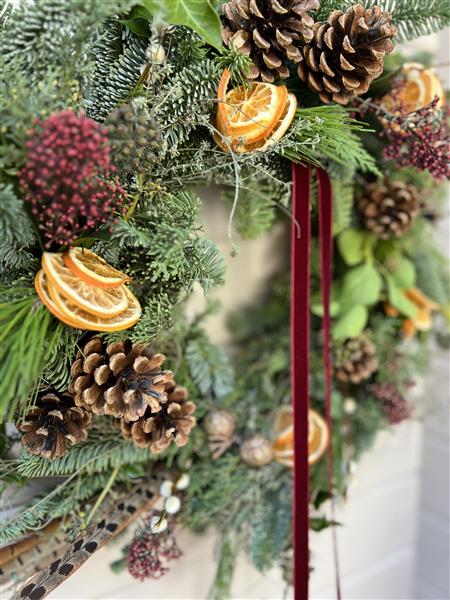 This is a Simply festive wreath made with orange slices, cones, pussy willow, skimmia, pheasant feathers and finished with Burgundy velvet ribbon tails