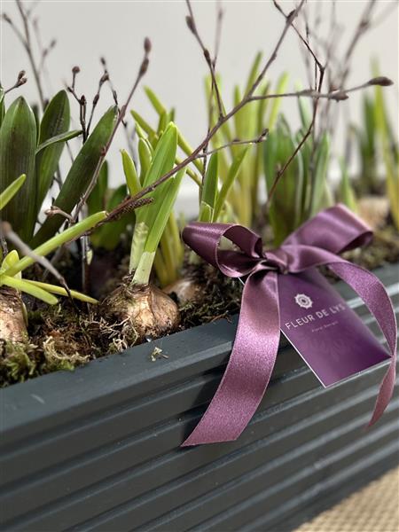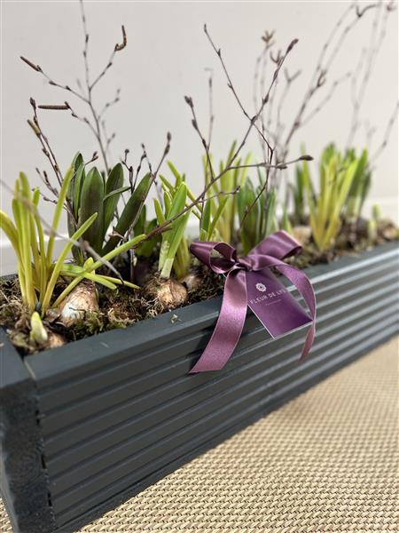 This Outdoor wooden planter is painted in Anthracite Grey and is filled with a mixture of mixed coloured Narcissi, Hyacinths and Muscari, finished with moss and birch twigs