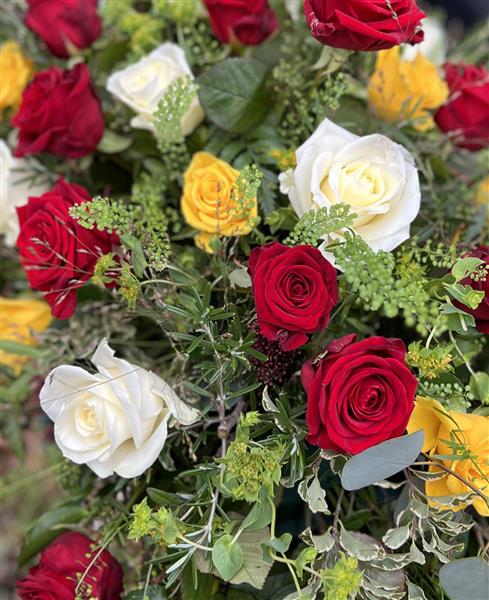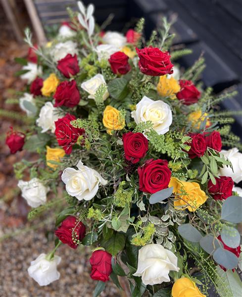 Picture shows 4ft Size - Mixed Red , White & Yellow Roses mixed with a variety of foliages