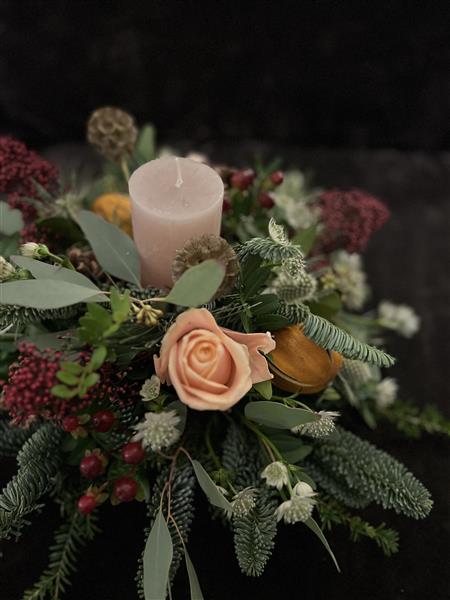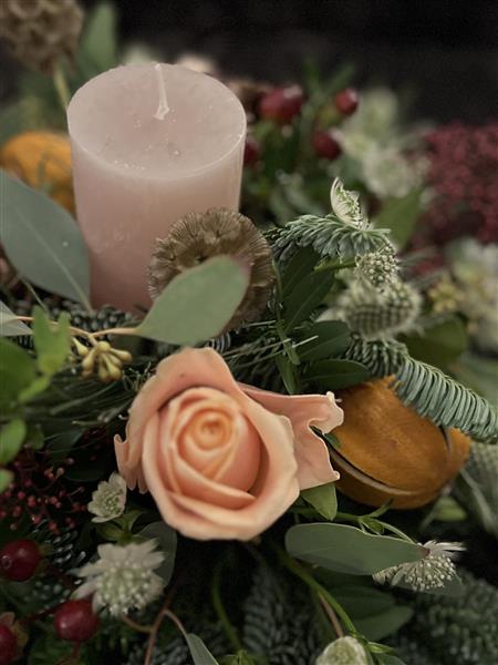 Our Rustic Christmas Table centre with Taupe Pillar Candle featuring Roses, Astrantia, Thistles, Skimmia, Oranges and Hypericum berries with Festive foliages