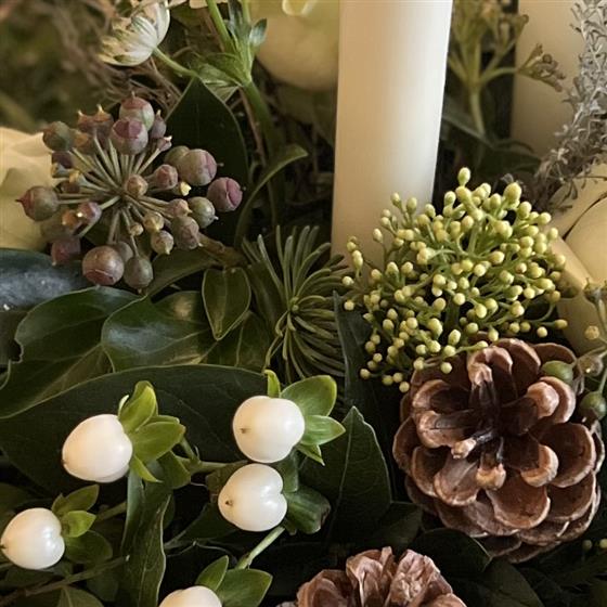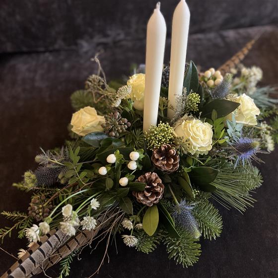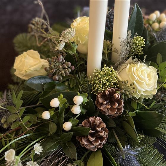 Creams with touch of blue makes this Winter Wonderland 2ft Table Arrangement. Complete with Candles